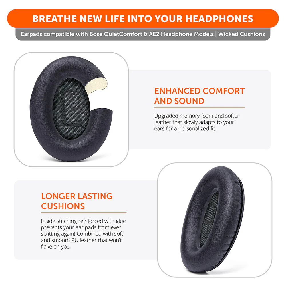 - Fits Like A Glove: These ear pads, made by Wicked Cushions, fit the following models of Bose Headphones perfectly: QuietComfort 35 & 35ii / Quiet Comfort 2 / Qc25 / Qc15 / Ae2 / Ae2i / Ae2w / SoundTrue / SoundLink